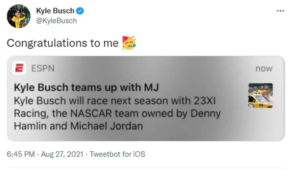 On Friday, Kurt Busch was officially named as the driver of the new No. 45 car for 23XI Racing for the 2022 NASCAR Cup Series season. The news hit social media like a bomb, as it came at 6PM ET on a Friday — not usually when big stories are broken. In the fever pace … Continue reading Kyle Busch Has Fun at ESPN’s Expense After Worldwide Leader in Sports Wrongly Announces Him Going to 23XI Racing